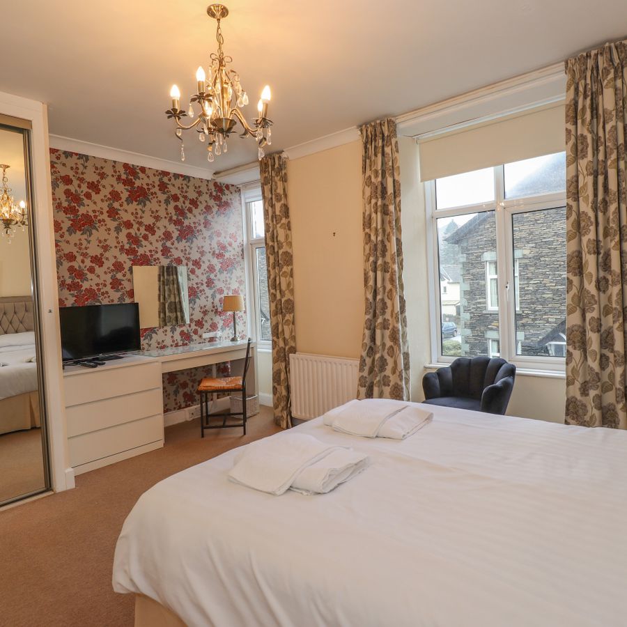On the second floor the Front Bedroom again has another huge floor to ceiling mirrored wardrobes reflect those views and give adequate storage. This bedroom with king size bed has additional natural light from a Velux window with views of Loughrigg. Freesat TV.