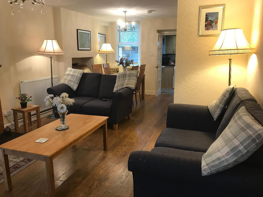 The comfortable lounge with traditional living fire has views of Silver Howe. The floor is oak. The dining area easily seats four has views towards Arthur's Seat. The fully equipped kitchen has washing machine, dish washer, gas cooker, 2 fridges and all the usual appliances. (There is a tumble drier and freezer in one of the substantial traditional stone and slate outbuildings). The stairs lead to the fully carpeted first floor with two bedrooms and fully tiled and recently refurbished shower / WC rooms. There are views of the fells to the north, east and west from both front and back bedrooms.