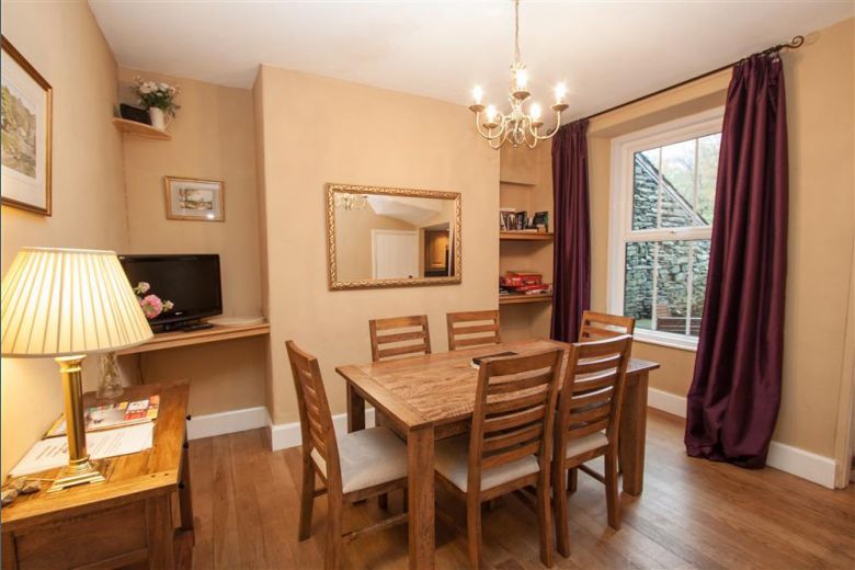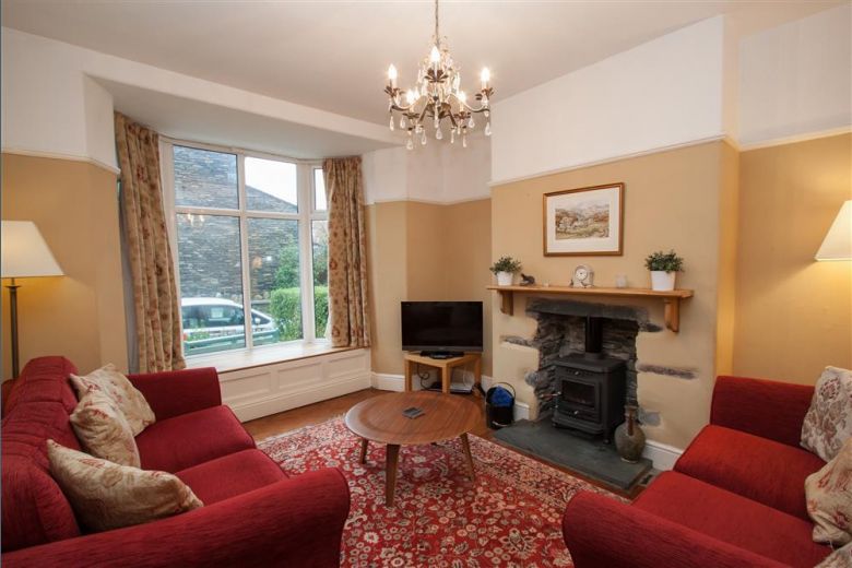 This traditional terraced house situated in the centre of Ambleside (behind the Glass House Restaurant) is on four floors. The front door leads from a small garden into a hall thence to the Lounge with west facing bay window with window seat, wood burning stove, polished wood floor with full sized rug and sumptuous sofas. Digital and Satellite TV and DVD player.