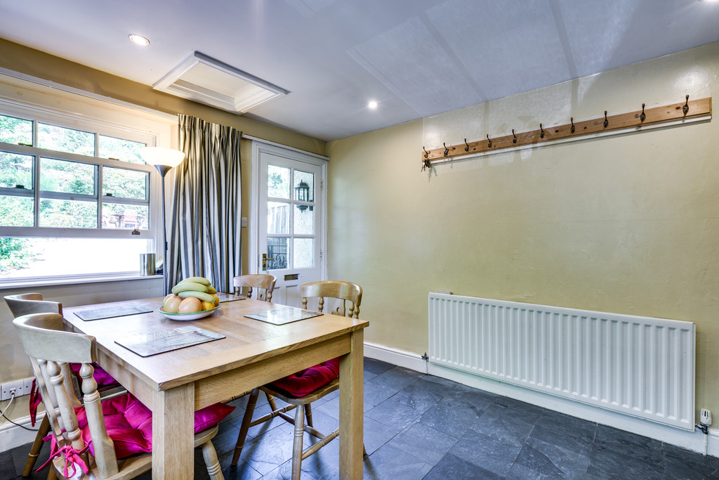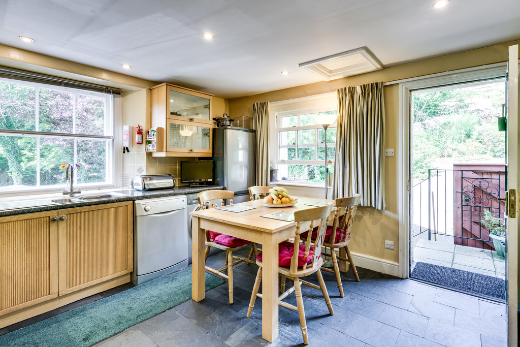 Todd Crag House occupies the upper level of this two storey stone built residence. Although this is is on the upper level access is easy. The house is built into the sloping garden. Three wide stone steps lead to the entrance door. There is ample space for 2 cars adjacent. The entrance door leads directly into the reception kitchen. The fully equipped natural oak dining kitchen with slate floor has views of the fells and garden.